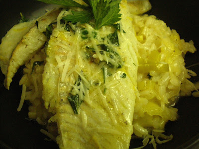 One thing that my hubby loves for dinner is risotto. I can get him to eat almost anything in a risotto and I have even done an experiment with this in the past. He hates salmon...refuses to eat it. Yet, when I made salmon, cream cheese and dill risotto...believe it or not, he ate it!! And didn't complain...amazing. So anyway, when I saw this recipe with fish on a bed of leek risotto, I thought it would be a good way to get him to eat his omega 3's for this week.